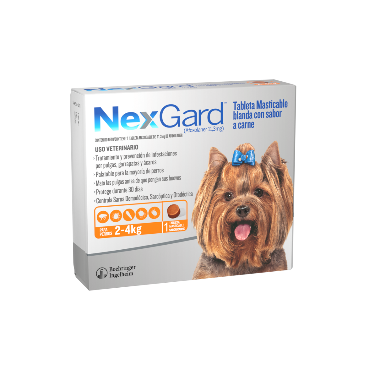 NexGard S (2 – 4 kg) es un antiparasitario externo en formato de tableta masticable sabor carne, diseñado especialmente para perros pequeños. Cada tableta contiene afoxolaner, un principio activo seguro y eficaz que actúa eliminando pulgas antes de que pongan huevos y combatiendo garrapatas que pueden transmitir enfermedades.