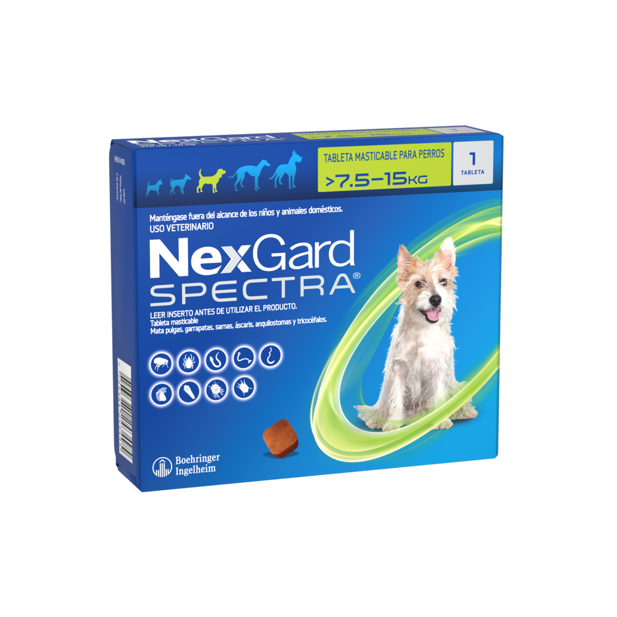 NexGard Spectra M Verde (7.5 – 15 kg) es un antiparasitario completo en formato de tableta masticable mensual, diseñado para perros medianos. Su fórmula combina afoxolaner y milbemicina oxima, ofreciendo una protección integral contra parásitos internos y externos en una sola dosis.