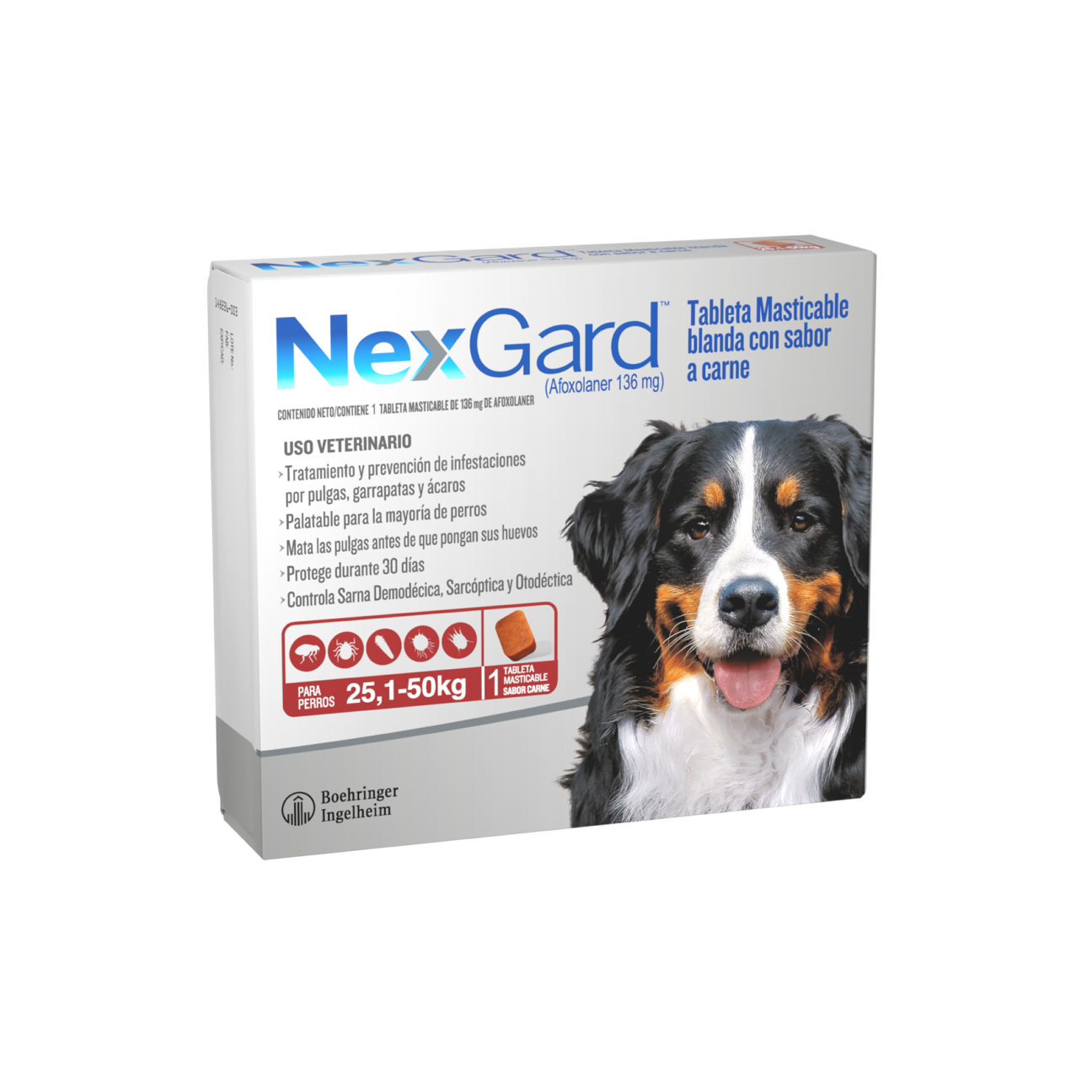 Cada tableta ofrece protección completa por 30 días, con la comodidad de una sola dosis mensual. Gracias a su sabor a carne, resulta fácil de administrar y bien aceptada por la mayoría de los perros.