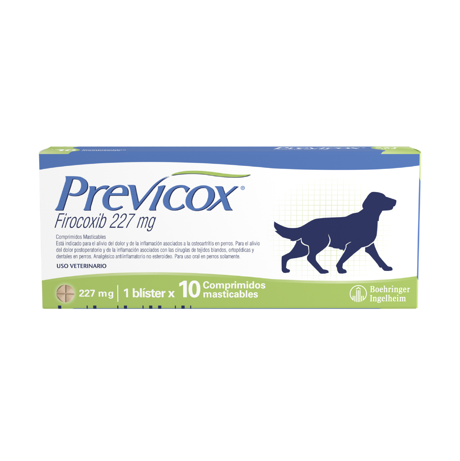 Previcox Dog L 227 mg es un antiinflamatorio no esteroide (AINE) de la familia de los coxib, formulado para perros de talla grande. Está diseñado para aliviar el dolor e inflamación asociados a la osteoartritis, displasia de cadera, artritis y también indicado en el manejo del dolor postoperatorio en cirugías ortopédicas o de tejidos blandos.